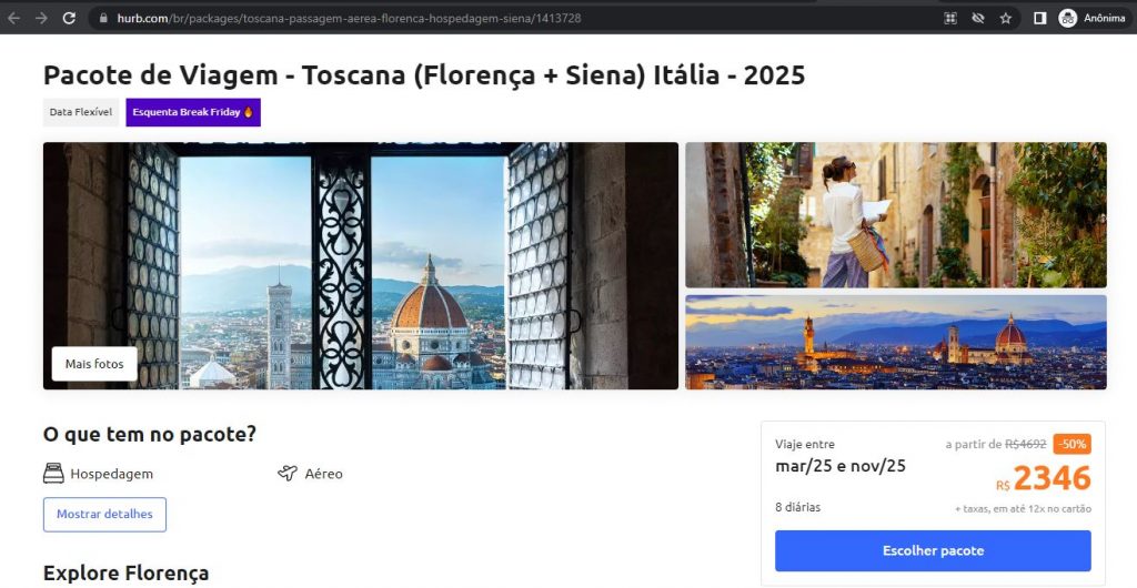 Na sexta-feira (28), por exemplo, um dos destaques no site da Hurb era uma viagem para Toscana (Florença + Siena), na Itália, em 2025, por R$ 2.346,00 + taxas, em até 12x no cartão, que inclui hospedagem e aéreo. A data da viagem é para março ou novembro.