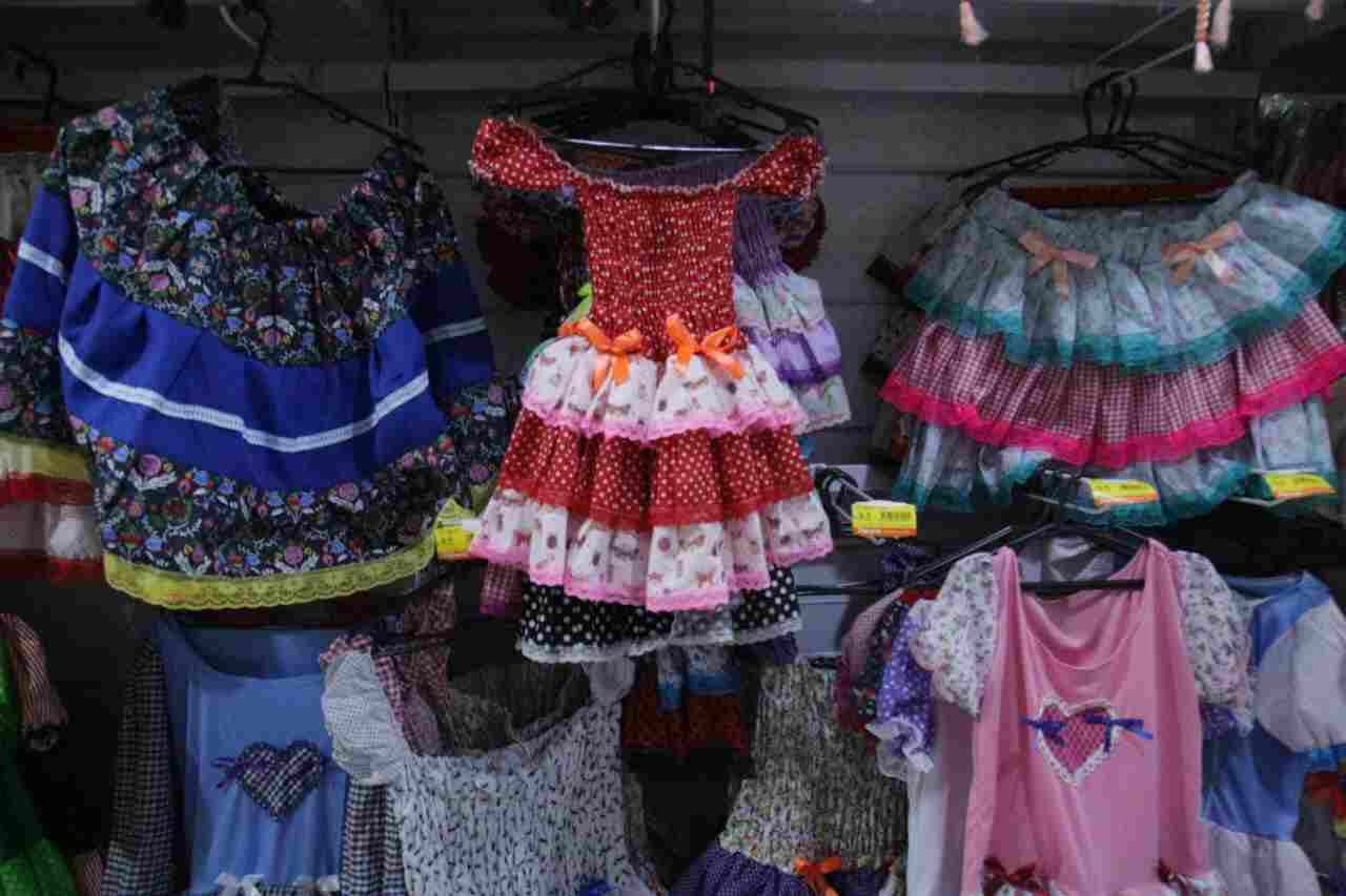 O colorido dos vestidos e amarelo dos chapéus já decora boa parte da vitrine gerenciada por Euza Maria de Lacerda. Apesar de voltado para roupas, acessórios de festas juninas começam a ganhar espaço na entrada do local e se tornam um dos carros-chefes do comércio.