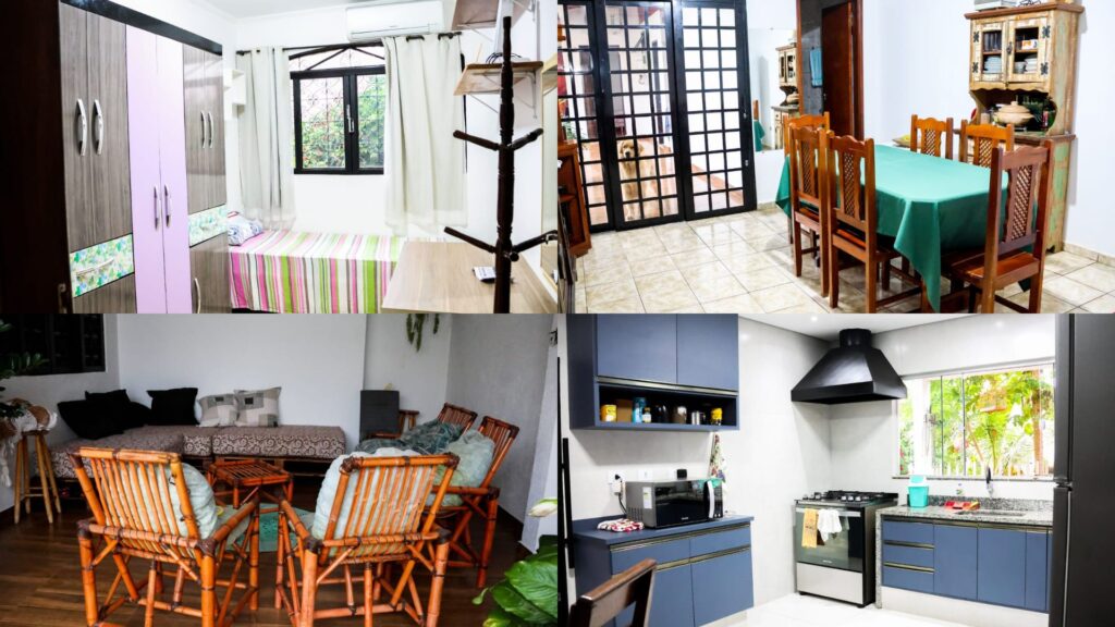 Os quartos disponíveis para alugar são equipados com cama, guarda-roupa, cortinas e ar-condicionado ligado por 24 horas. A casa também conta com câmeras de videomonitoramento para garantir mais segurança.