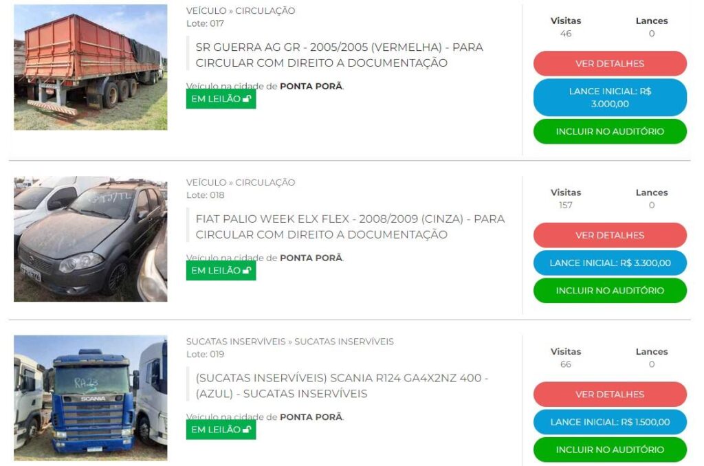 O lote 18 conta com um Fiat Palio Week ELX Flex, ano 2008/2009, apto a circular e localizado em Ponta Porã, que é disputado por R$ 3,3 mil. O menor lance no leilão é no sétimo lote, em um VW Gol, 2002/2003, localizado em Naviraí, disputado por R$ 1,4 mil.