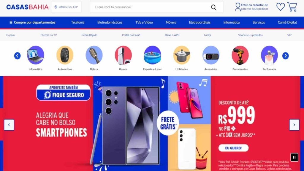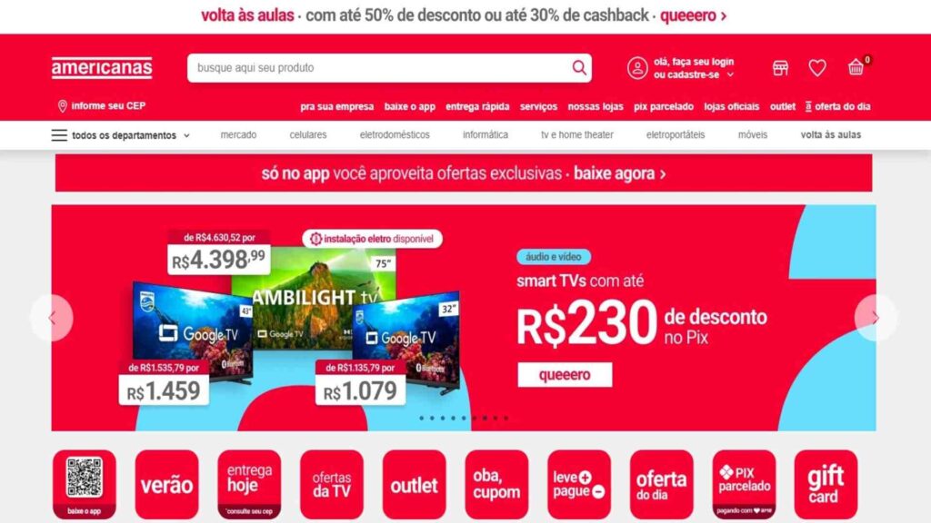 Na home do portal da Americanas, por exemplo, um anúncio chamava a atenção para o desconto de R$ 230 na compra de Smart TVs. O desconto nas Casas Bahia na compra de um Smartphone poderia chegar a R$ 999.