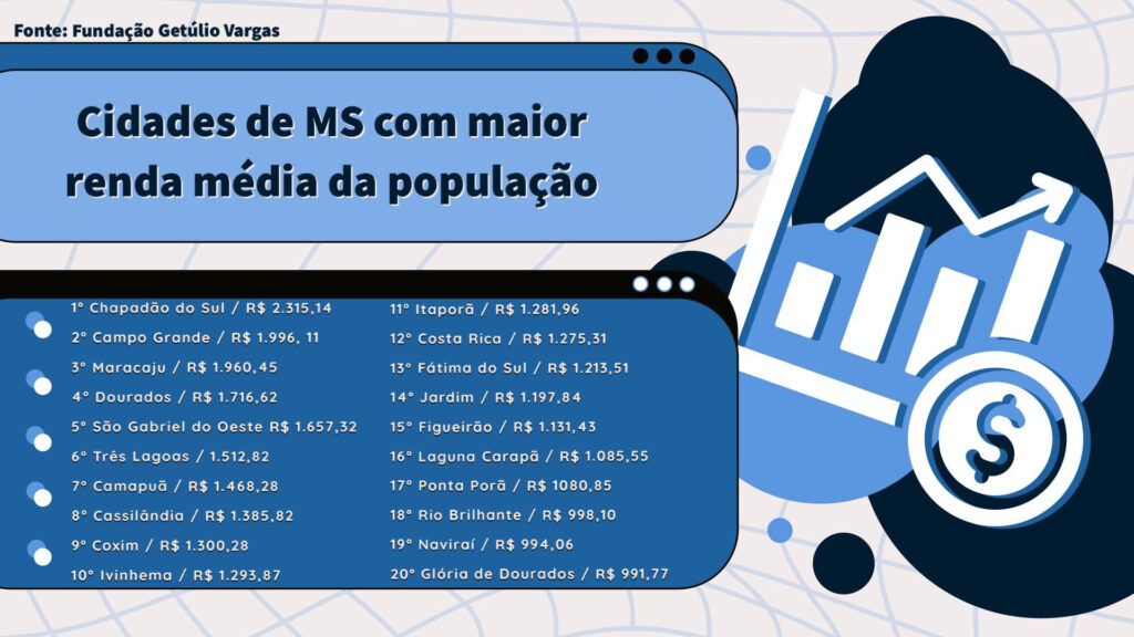 Conforme dados apresentados pelo Mapa da Riqueza, elaborado pelo centro de políticas sociais da Fundação Getúlio Vargas, Chapadão ficou à frente até da Capital, Campo Grande, que aparece no segundo lugar do ranking com renda média da população fixada em R$ 1.996,11. Na terceira colocação está Maracaju, com R$ 1.960,45.