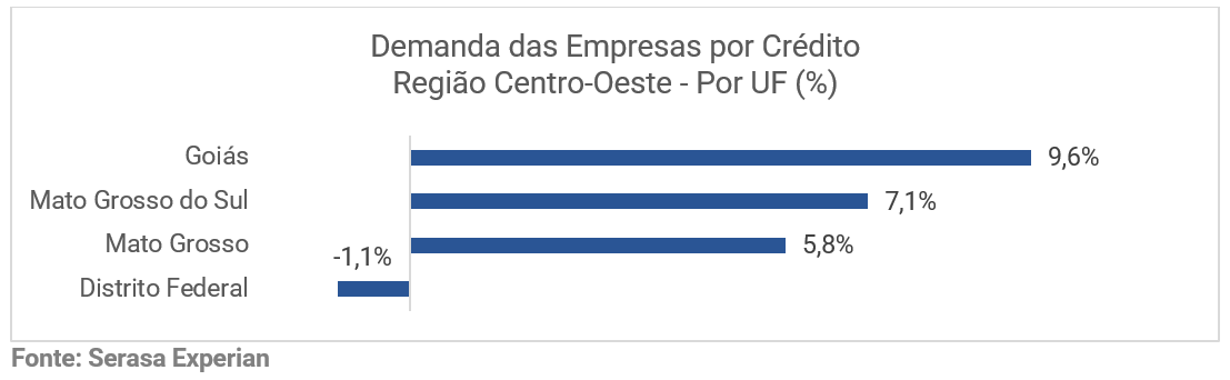 Segundo o Indicador de Demanda das Empresas por Crédito da Serasa Experian, em primeiro lugar na pesquisa aparece o estado de Goiás que teve o maior percentual (9,6%) e o Distrito Federal que registrou queda (-1,1%). Confira os indicadores: