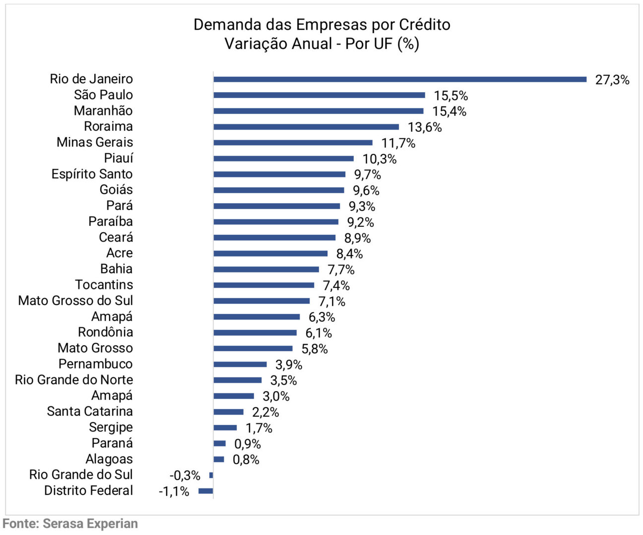 Apenas duas das 27 Unidades Federativas (UFs) do Brasil tiveram queda na demanda das empresas por crédito no mês de agosto, com destaque para Rio de Janeiro com a liderança do ranking. Confira:
