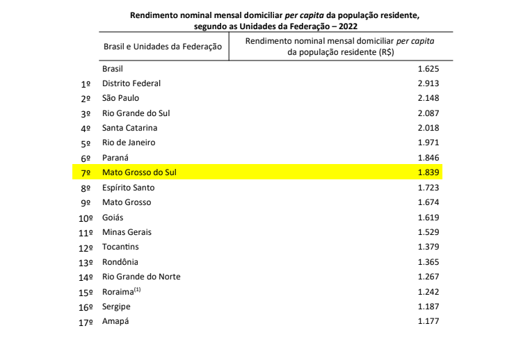 O IBGE (Instituto Nacional de Geografia e Estatística) divulgou nesta sexta-feira (24) a pesquisa de rendimento domiciliar per capita de 2022. Mato Grosso do Sul se classificou em 7ª lugar de maior rendimento no cenário nacional.