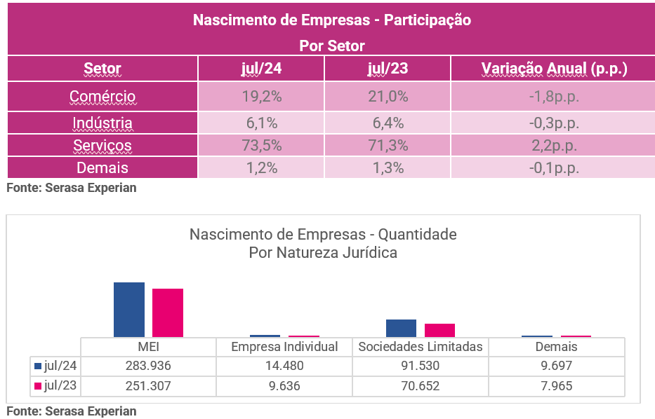 Além disso, o Indicador de Nascimento de Empresas da Serasa Experian mostrou que, em julho, foram criados 399.643 novos negócios no país. Este foi o maior número de aberturas da série histórica, iniciada em janeiro de 2010.