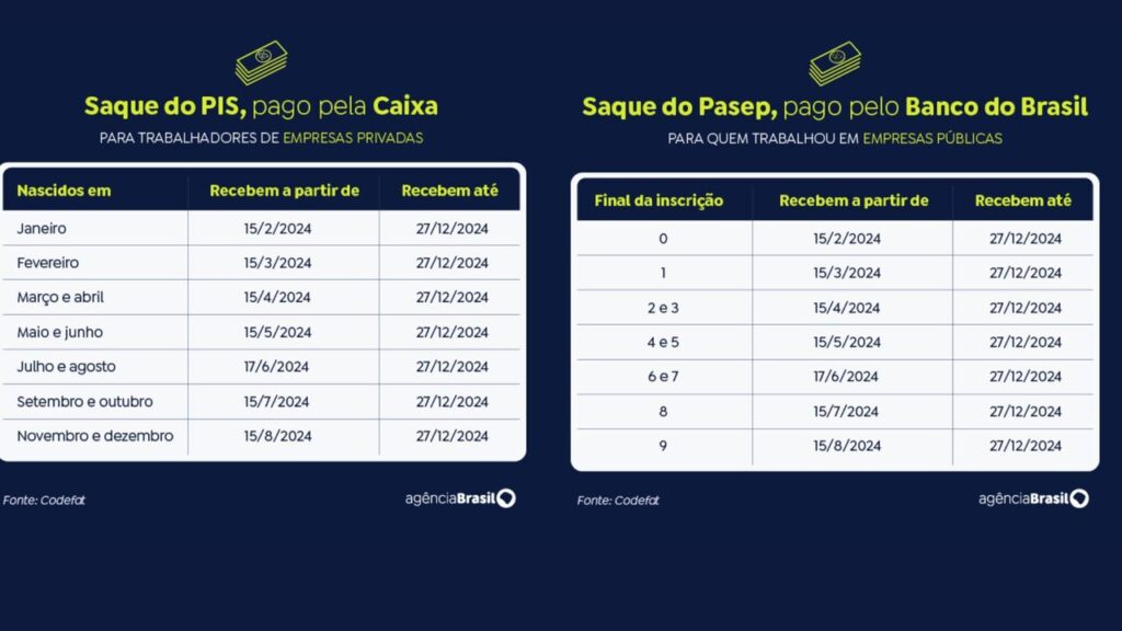 O PIS é pago pela Caixa Econômica Federal e o Pasep, pelo Banco do Brasil. Como ocorre tradicionalmente, os pagamentos serão divididos em seis lotes, baseados no mês de nascimento, no caso do PIS, e no número final de inscrição, no caso do Pasep. O saque iniciará nas datas de liberação dos lotes e acabarão em 27 de dezembro de 2024. Após esse prazo, será necessário aguardar a convocação especial do Ministério do Trabalho e Previdência.