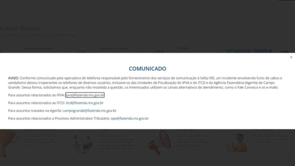 Segundo órgão, o problema no sistema foi causado por um incidente envolvendo furto de cabos e vandalismo, que deixou inoperantes os telefones de diversos usuários, inclusive os das Unidades de Fiscalização do IPVA, ITCD e da Agenfa (Agência Fazendária) de Campo Grande.