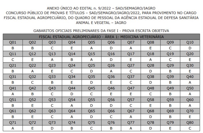 Foi publicado no DOE (Diário Oficial do Estado de Mato Grosso do Sul) desta terça-feira (24), o gabarito oficial preliminar da prova escrita objetiva do concurso para fiscal agropecuário da Iagro (Agência Estadual de Defesa Sanitária Animal e Vegetal).