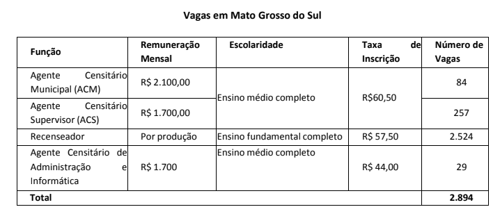 As inscrições para concorrer a 2.865 vagas temporárias do Censo 2022 foram prorrogadas até 21 de janeiro. São 2.524 vagas de nível fundamental para recenseadores distribuídas em todos os 79 municípios de Mato Grosso do Sul. Os recenseadores do IBGE atuarão diretamente na coleta das informações em mais de 920 mil domicílios de MS. Como o salário do recenseador é por produção, é possível simular a remuneração. A FGV (Fundação Getúlio Vargas) é a organizadora da seleção, clique aqui para se inscrever.