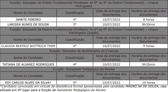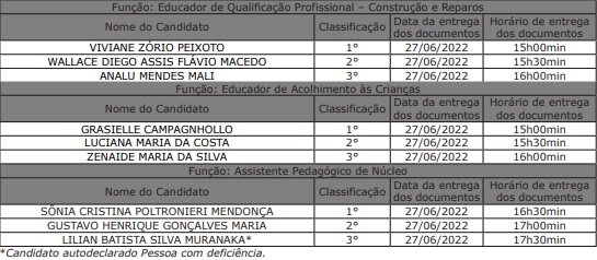 Os candidatos irão ocupar os cargos de educador de matemática, ciências da natureza e humanas, inglês, serviço social, construção e reparos, acolhimento infantil, e assistente pedagógico.