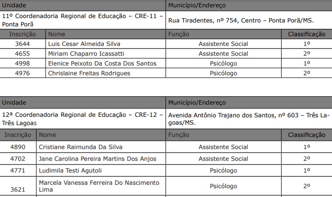 A lista relaciona a pontuação de cada candidato e a unidade em que será direcionado para a entrega de documentos e comprovação dos requisitos exigidos na função. Os formulários para contratação estão disponíveis no site www.sed.ms.gov.br, e devem ser entregues assinados.
