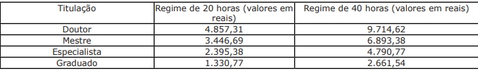 Os salários variam conforme a especialização e carga horária. Para graduados, o salário é de R$ 1.330,77 para 20h semanais e 2.666,54 para 40h. Já o candidato com título de doutor receberá 4.857,31 para 20h e 9.714,62 para 40h semanais.