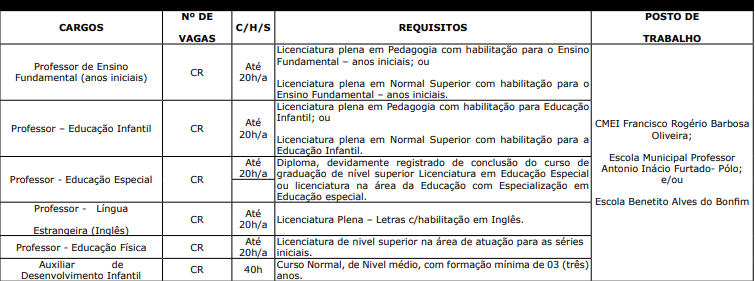 Os candidatos devem atender demandas do CMEI Francisco Rogério Barbosa Oliveira, Escola Municipal Professor Antonio Inácio Furtado- Pólo e/ou Escola Benetito Alves do Bonfim. O salário varia de R$ 1.692,19 a R$ 2.668,71 e carga horária de 20h a 40h semanais.
