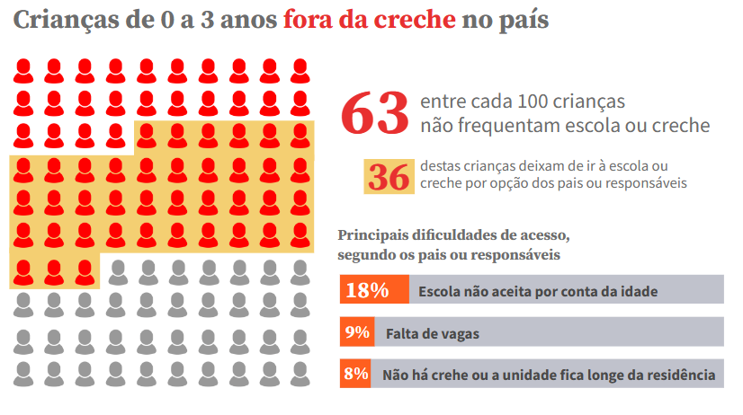 Entre as crianças que não frequentam creche, as principais dificuldades apontadas pelos pais ou responsáveis são: a unidade escolar não aceita a criança por conta da idade (18%); falta de vaga (9%); não há creche ou fica longe da residência (8%). Uma parcela significativa (57%) deixou de ir para escola por escolha dos pais ou responsáveis – que as consideram muito novas ou preferem cuidar delas em casa.