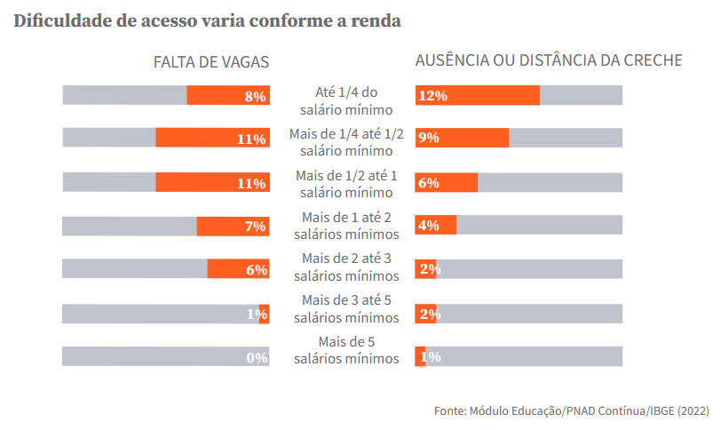 A dificuldade de acesso a creches afeta de maneira distinta a população de acordo com a renda. Para famílias que recebem até 1/4 do salário mínimo, a falta de vagas é apontada por 8% como motivo para as crianças não frequentarem creche; a ausência ou distância da creche representa motivo para 12% das famílias. Já entre o grupo de famílias que recebem mais de 3 até 5 salários mínimos, os percentuais são de 1% e 2%, respectivamente.