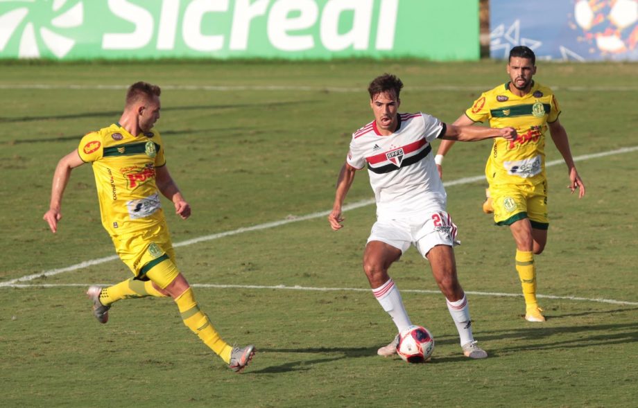O jogo começou com o São Paulo apostando na posse de bola. Mas enfrentava dificuldades. O Mirassol buscava oportunidades pressionando a saída de bola da equipe tricolor. A primeira chance do São Paulo foi em jogada trabalhada pelo lado esquerdo. Vitor Bueno dividiu bola com o goleiro Muralha, mas não conseguiu concluir o lance. A partida se mostrava aberta, com marcação mais frouxa.