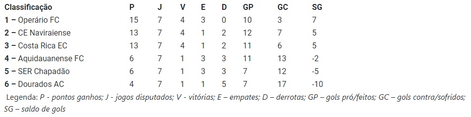O Operário voltou a assumir a liderança do Campeonato Sul-Mato-Grossense de Futebol Série A 2022, após vencer o Naviraiense, por 1 a 0, no domingo (10), pela sétima rodada do hexagonal final. Já o Costa Rica goleou o Dourados, por 5 a 1, e encostou na liderança.