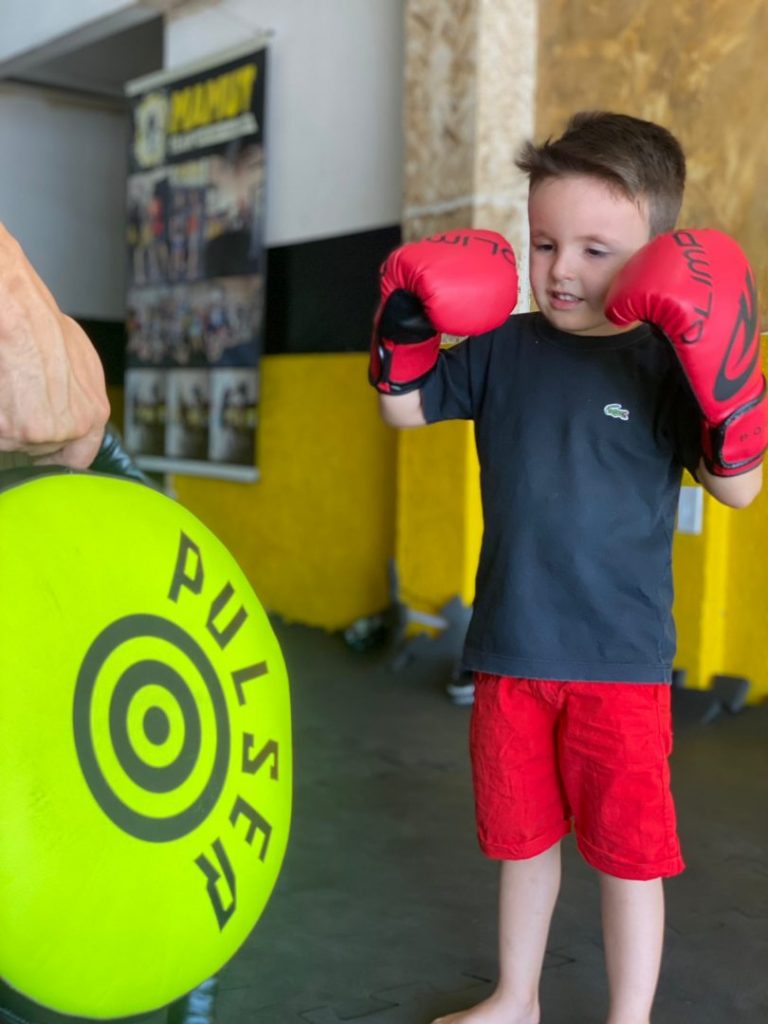 Joaquim, de 4 anos, é um dos alunos mais novos na academia. Dia de aula é só alegria para o menino, que tem transtorno do espectro autista. “Ele é agitado e o muay thai é ótimo para gastar a energia. Fora que está ajudando ele a interagir melhor com outras crianças e a ter mais disciplina”, conta Fábio Trindade, pai do garoto e praticante de muay thai há 11 anos.