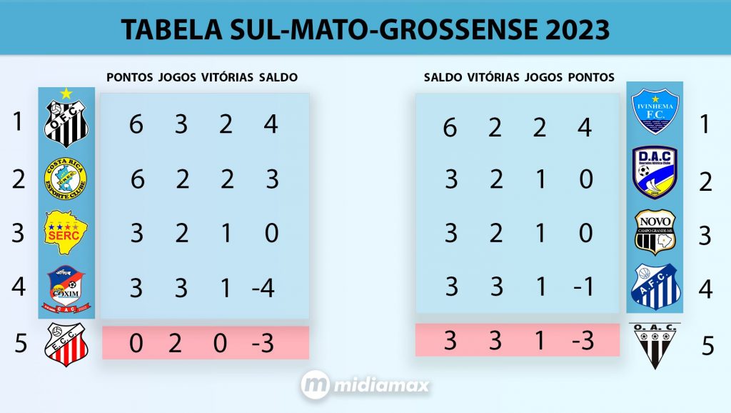 Confira a tabela e a colocação dos times que disputam o Campeonato Estadual do Mato Grosso do Sul 2023