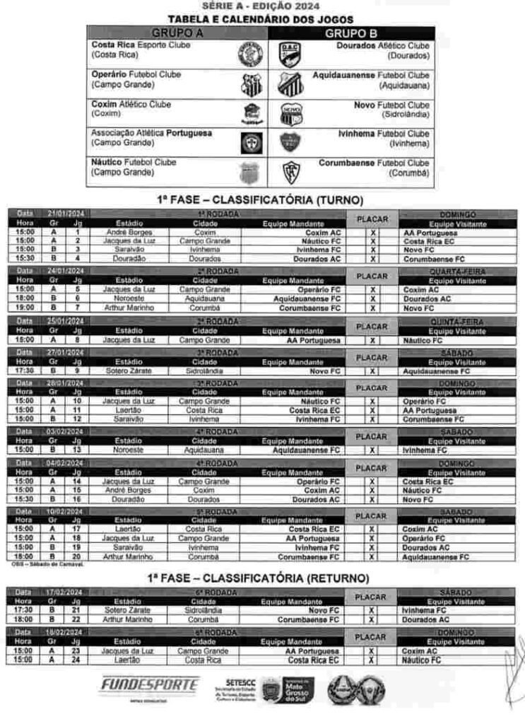 No próximo dia 21, o Estadual começa com quatro partidas do Grupo A e B. Coxim e Portuguesa no estádio André Borges em Coxim às 15h. Náutico e Costa Rica no Jacques da Luz, em Campo Grande, às 15h, Ivinhema e Novo no Saraivão, em Ivinhema, às 15h, e Dourados e Corumbaense no Douradão, às 15h30.