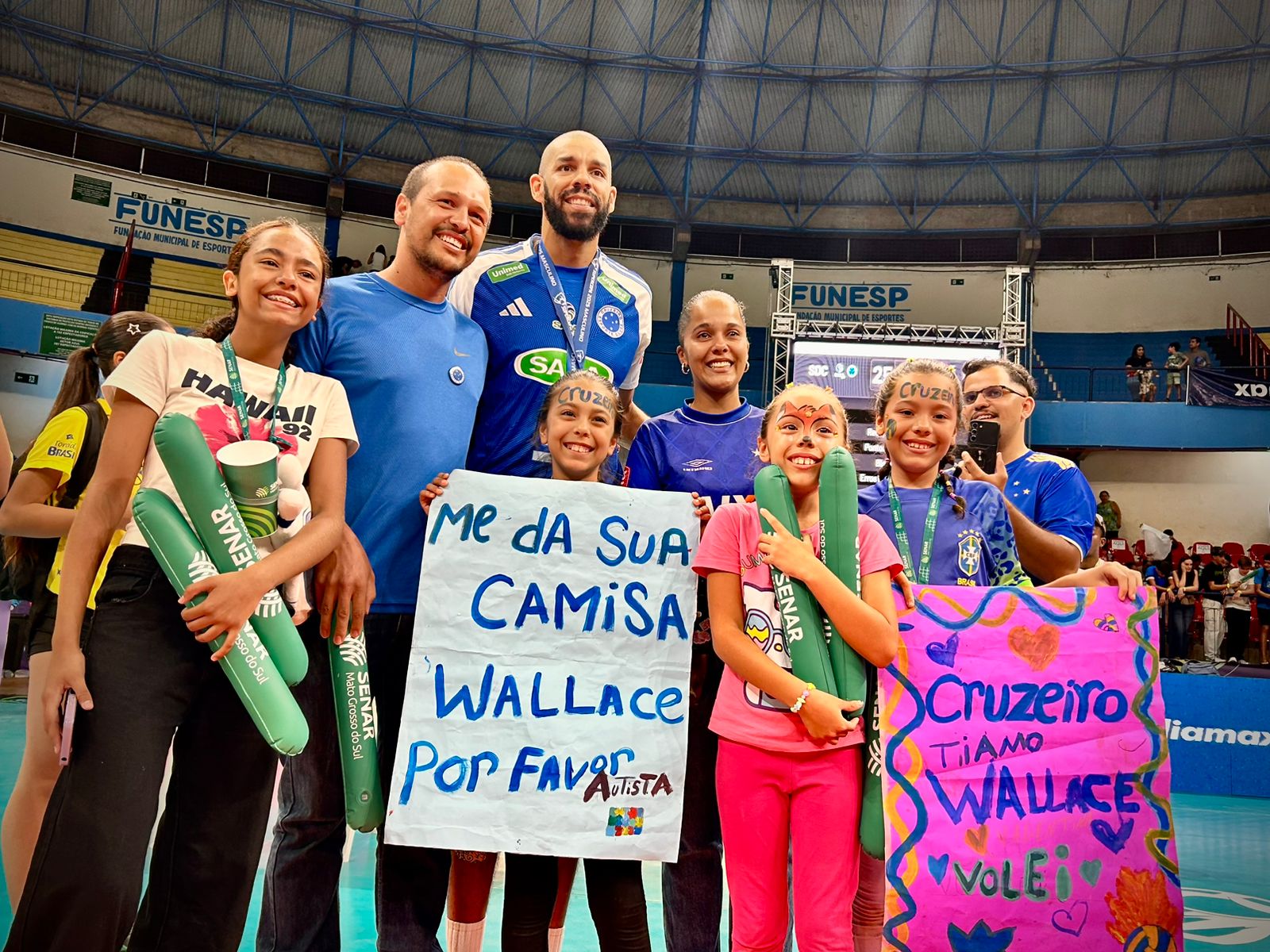 No segundo e último dia de Supercopa de Vôlei em Campo Grande, uma família especial chamou atenção. Nas arquibancadas, quatro menininhas juntas dos pais erguiam, orgulhosas, um cartaz que dizia: “Te amo Wallace”. O jogo deste domingo (19) colocou em confronto os times mineiros Sada Cruzeiro e Itambé Minas.