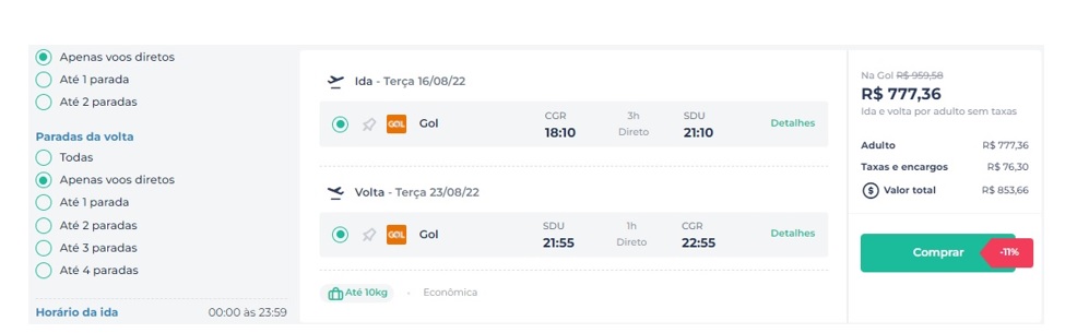 Os voos da Gol serão operados sempre às terças-feiras. Quem foi viajar no mês de agosto de Campo Grande para a “Cidade Maravilhosa” encontra passagens aéreas de ida e volta por R$ 853, 66, valor com as taxas inclusas. (Veja detalhes na imagem abaixo). A viagem de avião entre as duas capitais dura três horas em voo direto.