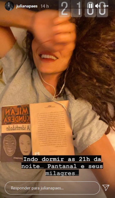 Em foto deitada, marcando 21 horas no relógio, com um fone de ouvido e um livro na mão, a atriz contou que está conseguindo dormir cedo. “Indo dormir às 21h da noite… Pantanal e seus milagres”, escreveu ela sobre a imagem. Mérito de MS?