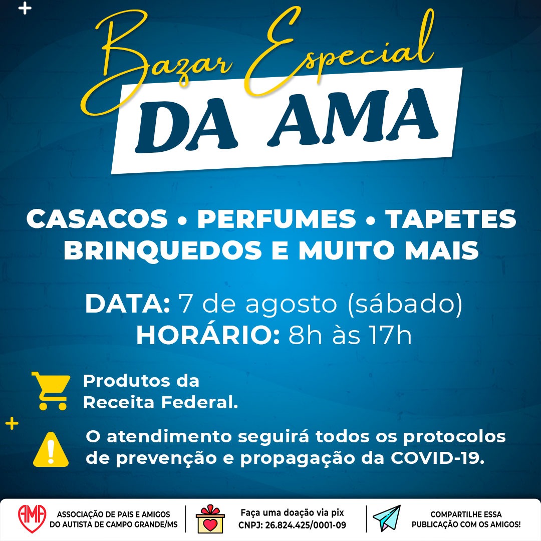 O bazar vai acontecer na própria sede da instituição, localizada na Avenida Bandeirante, nº 215, bairro Amambaí, das 8h até às 17h. Toda a renda adquirida será revertida para o custeio de despesas da AMA, que atende 113 crianças, adolescentes e adultos com Transtorno do Espectro do Autismo – Tea.