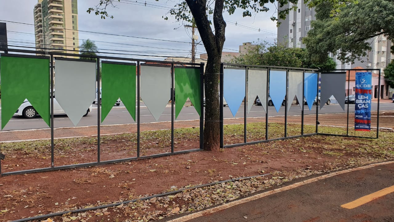 Instalada no canteiro central da Avenida Afonso Pena, entre as ruas Padre João Crippa e Pedro Celestino, grandes estruturas de metal ostentam bandeirinhas coloridas, como as que são penduradas nos arraiás brasileiros.