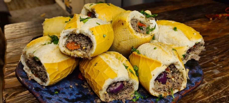 Em uma panela coloque a cebola no azeite e junte a carne moída, refogue até ficar soltinha. Tempere com sal, chimichurri, azeitona, pimenta de bico e salsa. Faça um buraco em um dos lados de cada um dos pães empurrando o miolo, passe maionese com a ajuda de uma colher e recheie bem com a carne moída refogada.
