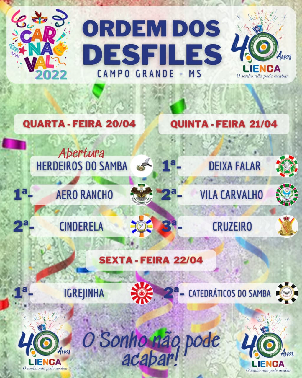 Conforme deliberado entre a Lienca (Liga das Entidades Carnavalescas de Campo Grande) e as escolas de samba, seguem as datas e ordem dos desfiles este ano. Confira abaixo: