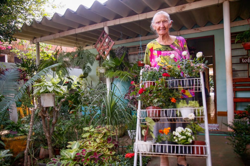 Ao falar sobre flores, D. Izolda abre um sorriso lindo e largo. “A natureza é beleza, representa o que Deus nos deixou aqui na terra. Eu amo estar em contato com elas. Quando acordo, estou sempre orando para não cair e nem escorregar, principalmente porque eu mudo de lugar, mexo bastante aqui. Na minha idade isso é problema, mas nunca aconteceu”, conta.