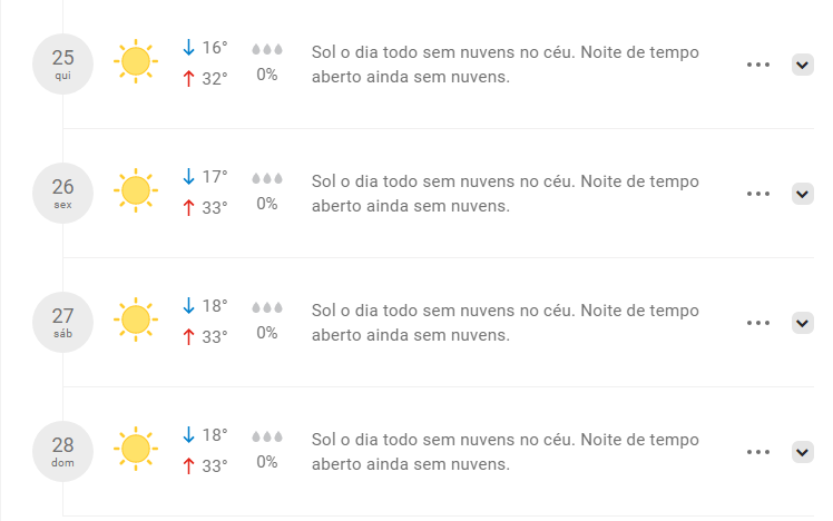 Tá, mas e lá em Bonito no festival?! Boa notícia para quem gosta de uma temperatura agradável, de sol e céu aberto, com temperaturas mínimas na base dos 20° e máximas, lá pelos 30°, 31°.