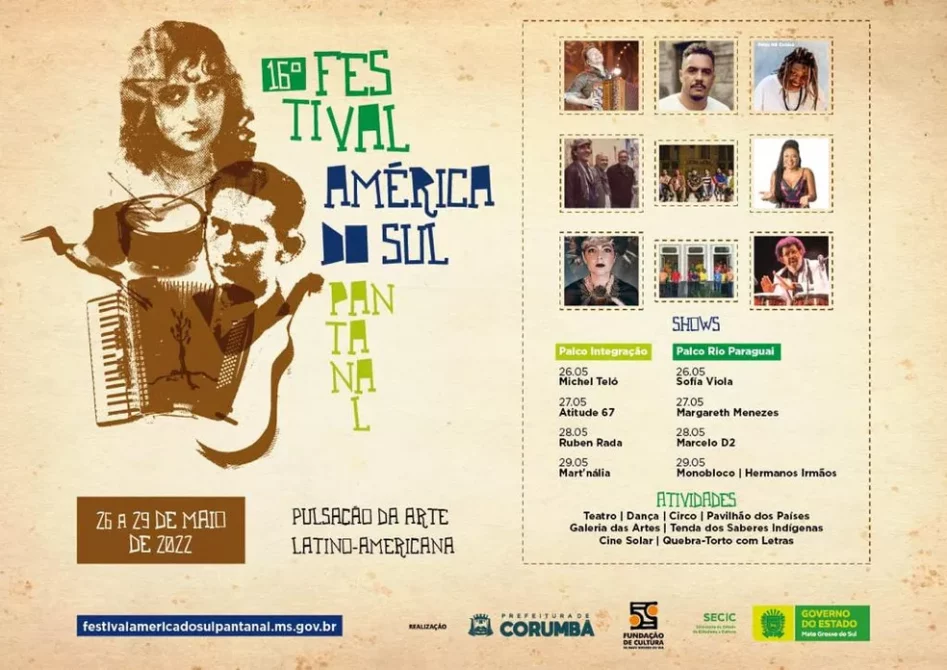 O Festival América do Sul Pantanal acontece entre os dias 26 a 29 de maio, em Corumbá, Ladário, Puerto Quijarro e Puerto Suárez.