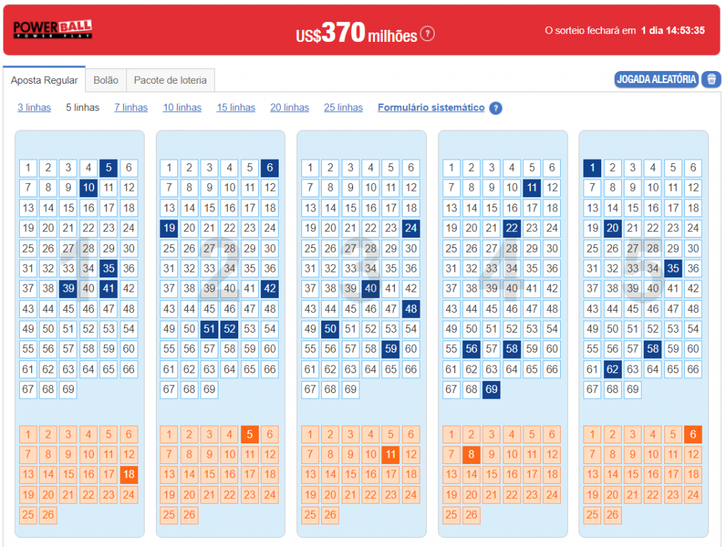 1. Acesse a página da Powerball na TheLotter e escolha seus números da sorte: 5 números principais e um número adicional.