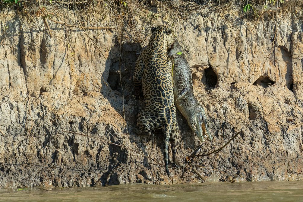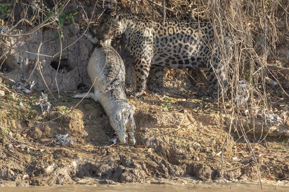 Às margens do Rio Miranda, no Pantanal sul-mato-grossense, uma outra onça foi flagrada enquanto abocanha um jacaré e sobe em um barranco. O flagrante foi feito em maio, por um empreendedor identificado como Juan Pablo Sorin.