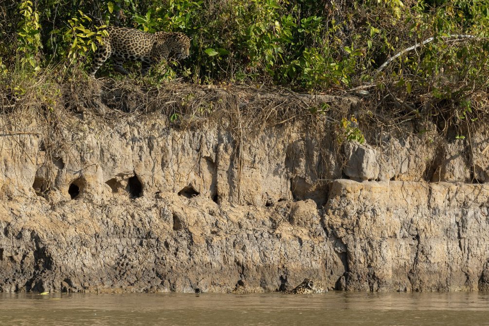 “A gente não viu ela caçando, não dá nem pra saber se ela que matou esse jacaré ou se foi uma onça que matou e ela roubou… foi legal que a gente ficou observando e nós vimos que em cima, na parte de cima do barranco do rio, tinha uma outra onça acompanhando. Não sabemos se ela queria ajudar ou se queria roubar o jacaré dessa que estava dentro da água, ou se era dela esse jacaré e ela estava querendo recuperar de volta”, pontua Daniel.