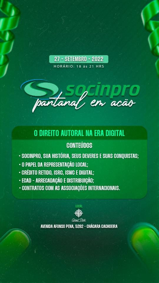 Todos os artistas, compositores e profissionais do meio musical são convidados a prestigiar o evento gratuito Pantanal em Ação. O objetivo deste encontro é apresentar a equipe Socinpro local, explicar sobre o trabalho com direitos autorais, tirar possíveis dúvidas e trocar experiências.