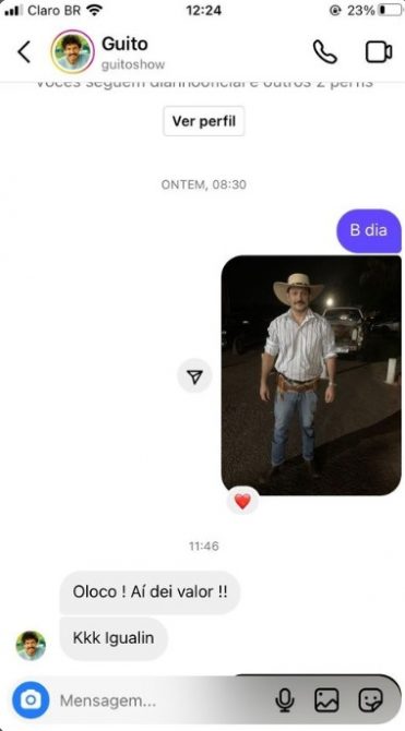 Devidamente vestido, com roupas idênticas, bigodão destacado e chapéu na cabeça, o sul-mato-grossense bateu uma foto e enviou a Guito, que prontamente respondeu o fã: “Ôloco! Aí dei valor. Igualin”, escreveu o cantor famoso, reconhecendo a semelhança.