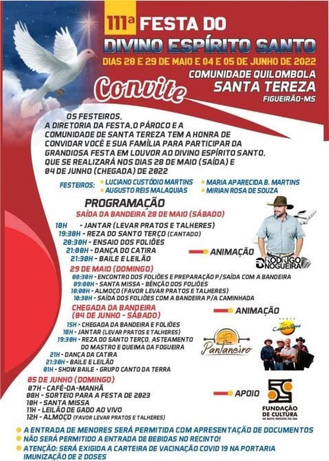 Após 2 anos sem a festividade já declarada como bem de natureza imaterial de Mato Grosso do Sul, a expectativa é que ao menos mil pessoas participem da 111ª Festa do Divino Espírito Santo, na Comunidade Quilombola Santa Tereza, em Figueirão, região norte do Estado. Serão dois finais de semana de programação, a partir deste sábado (28).