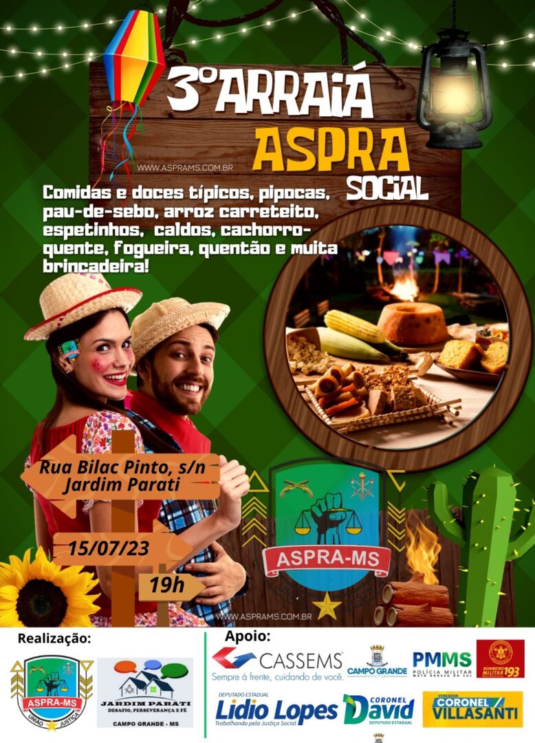 Neste sábado acontece o 3º Arraiá ASPRA Social. No evento haverá comidas e doces típicos como caldos, carreteiro, espetinhos e cachorro-quente, além de muitas brincadeiras.