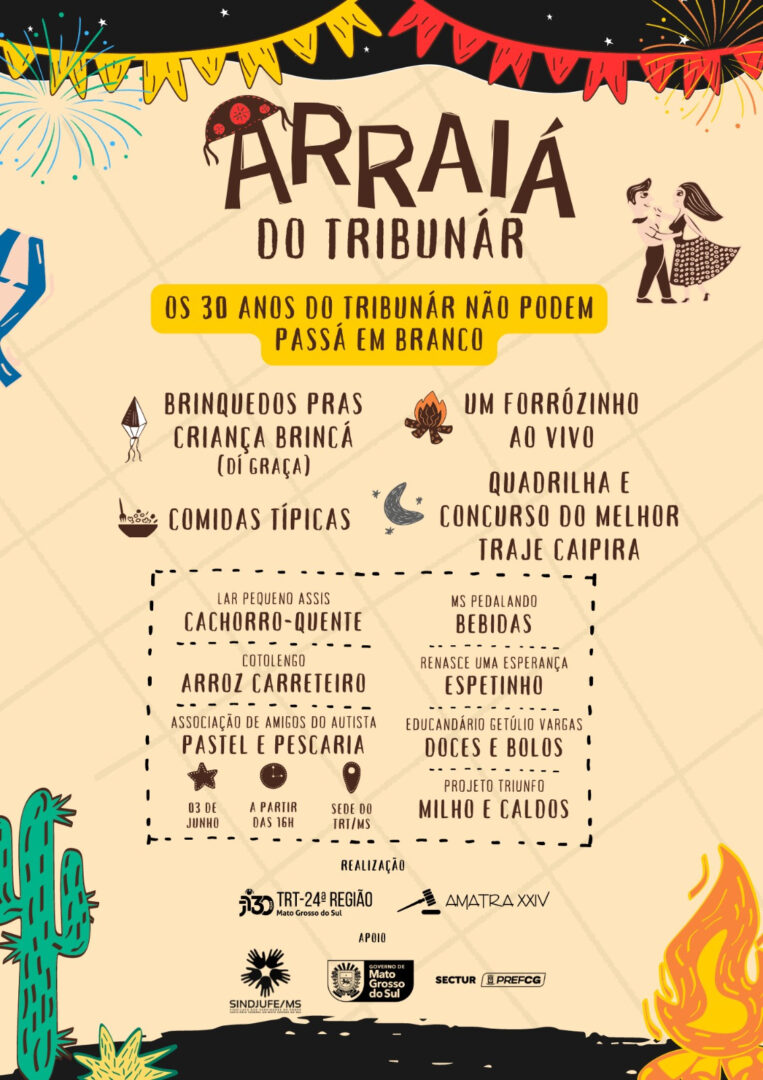 O “Arraiá do Tribunár”, que comemora os 30 anos do TRT/MS (Tribunal Regional do Trabalho), neste sábado (3), a partir das 16h, é aberta para toda a população campo-grandense.