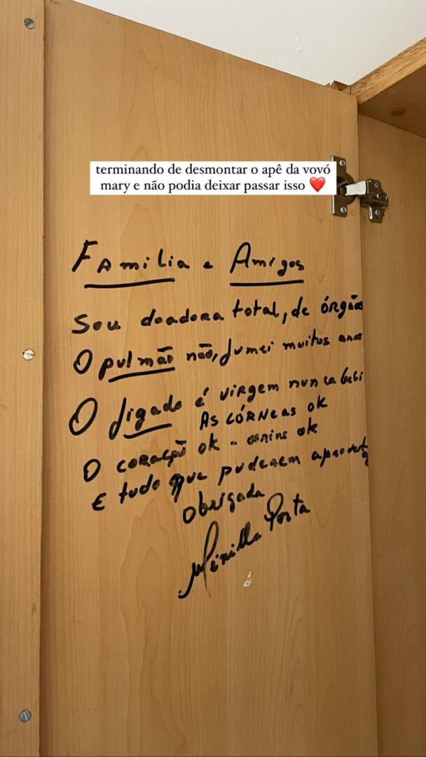 Mulher muito a frente do seu tempo, com uma agenda cheia de compromissos e “viciada” em figurinhas de bom dia do WhatsApp, Mary sempre teve a mania de escrever bilhetinhos por toda a casa, para nunca esquecer os afazeres do dia e, ao perceber que aos poucos a doença avançava, deixou um último pedido anotado para a família, que se surpreendeu no dia da mudança.