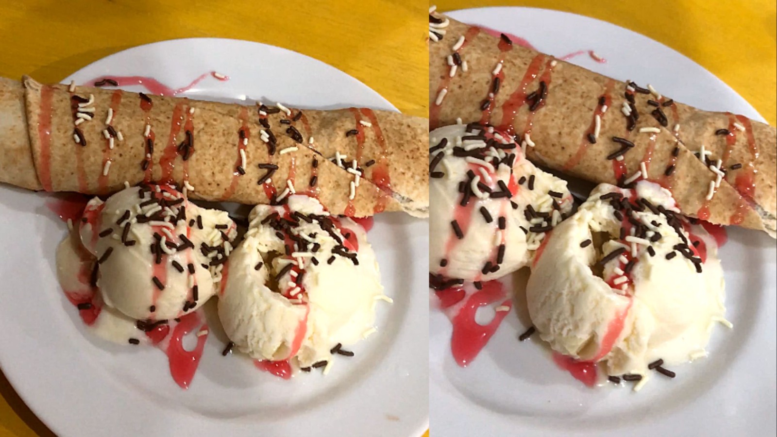 Tem apenas uma opção do shawarma doce, servido com pão árabe, bolas de sorvete de creme e o recheio nas opções de brigadeiro, beijinho ou ninho. Escolhi a de brigadeiro, que sabor incrível. Acreditei que a mistura de pão com chocolate não seria uma boa, mas o prato combina muito bem.