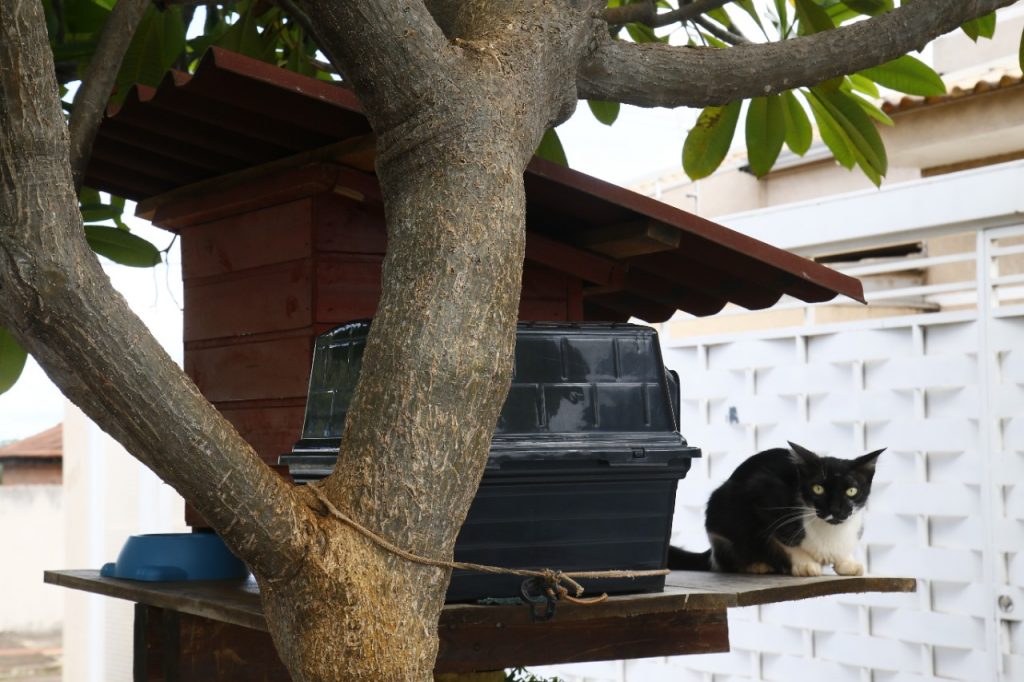 Foi um mestre de obras quem deu a ideia de usar um tronco para suspender a casinha, de forma que ficasse longe do alcance dos cachorros e atendesse à preferência dos felinos por altura. Laura pediu e ele fez tudo sem cobrar. “O Alisson, esse mestre de obras, reformou a frente aqui de casa e desde o primeiro dia do trabalho dele eu falava da ideia dessa casinha. Ficou melhor do que eu imaginava”, conta.