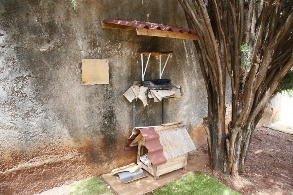 A estrutura é resistente e não molha. A moradora comprou uma telha para garantir que também servisse de abrigo à chuva aos bichanos. “Mesmo nesses dias de chuvarada, pode ver que as camas e a ração ficam secas”, mostra.