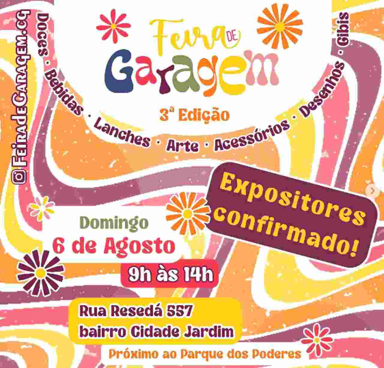Neste domingo acontece mais uma edição da Feira de Garagem, com vários expositores já confirmados. No evento vai ter muita gastronomia, expositores de acessórios, cadernos artesanais, bordados, crochê, cosméticos e artes.