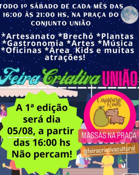 Todo 1º sábado de cada mês vai acontecer a Feira Criativa União, com expositores de artesanato, brechó, plantas, gastronomia, músicas e muito mais.