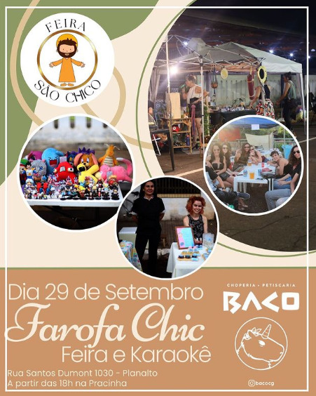 Nesta sexta, acontece a Farofa Chic, que mistura as feirinhas que amamos, com o karaokê que garante a diversão de todos. Lá haverá diversos expositores locais e atrações para toda a família.